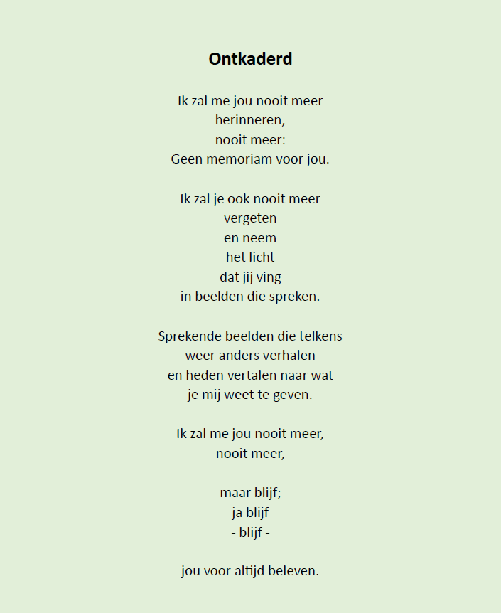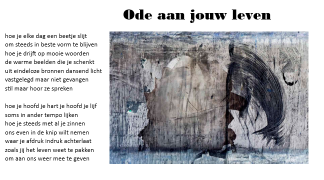 Als reactie op haar expositie ‘Ode aan het leven’ schreef ik een gedicht bij een foto van haar.