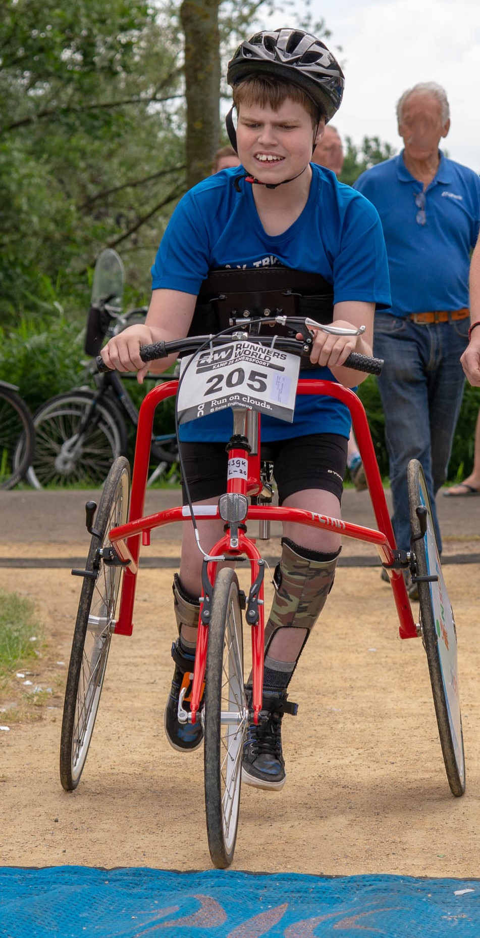 Sinds kort zijn de foto’s veranderd. Een racerunner in tijdelijke bruikleen, die hem actief zijn benen laat bewegen. Op maat afgesteld, om zijn beperkingen zoveel mogelijk op te heffen.